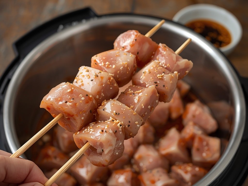 - 6. Thread the marinated chicken cubes onto the skewers, leaving a small space between each piece to ensure even cooking.