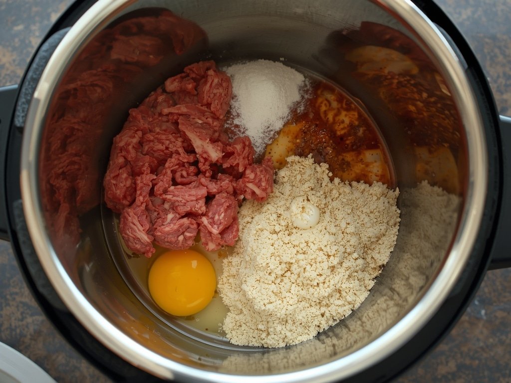 - In a large bowl, combine ground beef, onion soup mix, bread crumbs, egg, Worcestershire sauce, garlic powder, and black pepper. Mix gently.