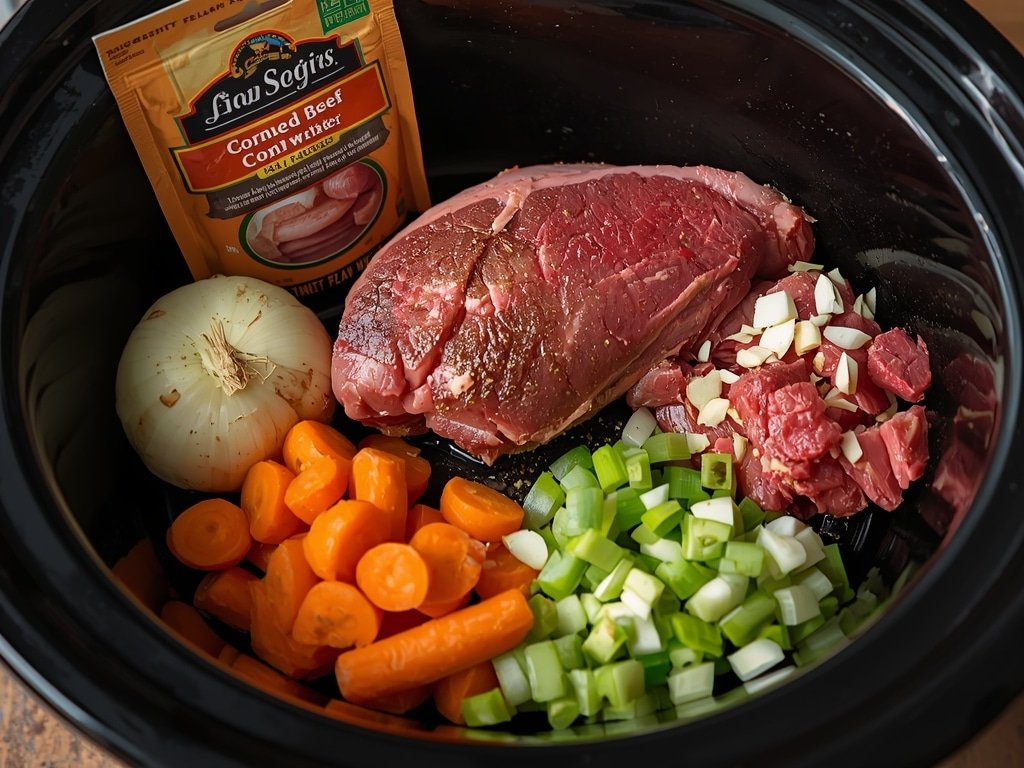 - 2. Layer the Vegetables: Place the quartered onion, chopped carrots, and chopped celery stalks in the bottom of your slow cooker. This creates a flavorful bed for the corned beef and prevents it from sticking to the bottom.