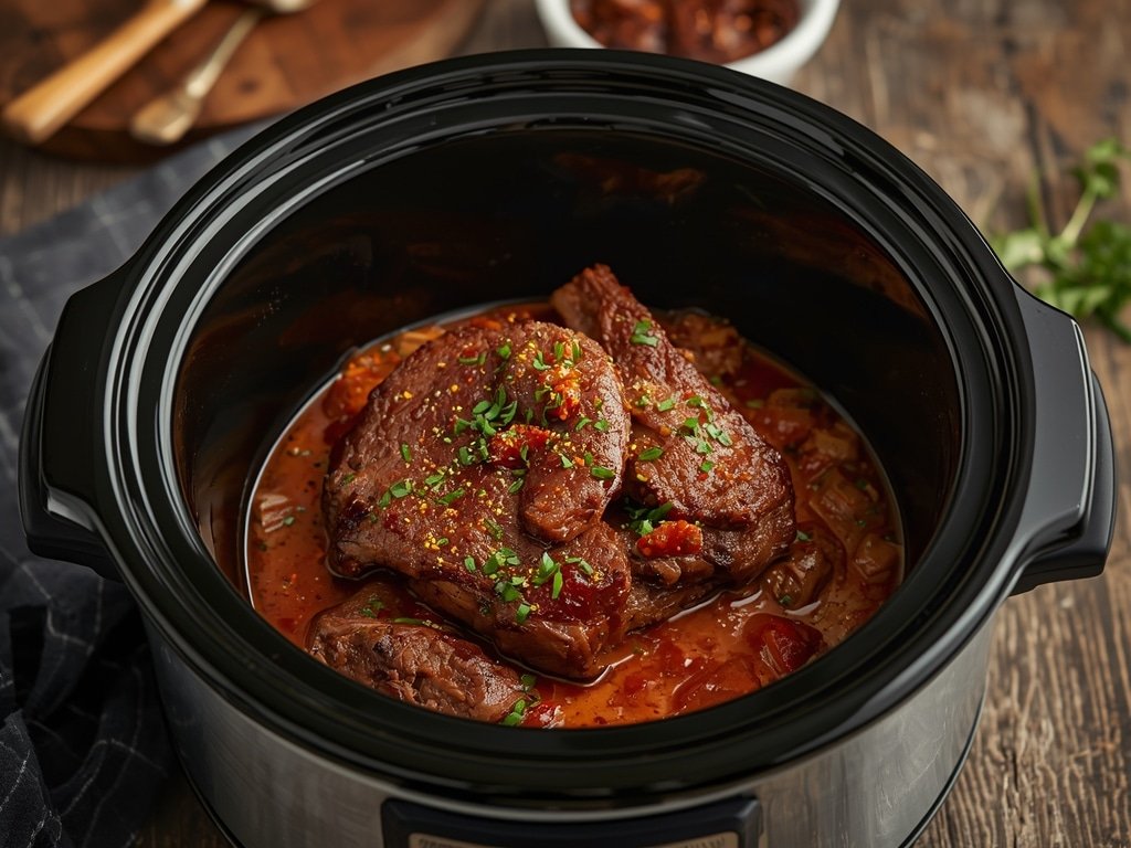 4. Cover and cook on low for 7-8 hours, or on high for 3-4 hours, until the beef is fork tender.