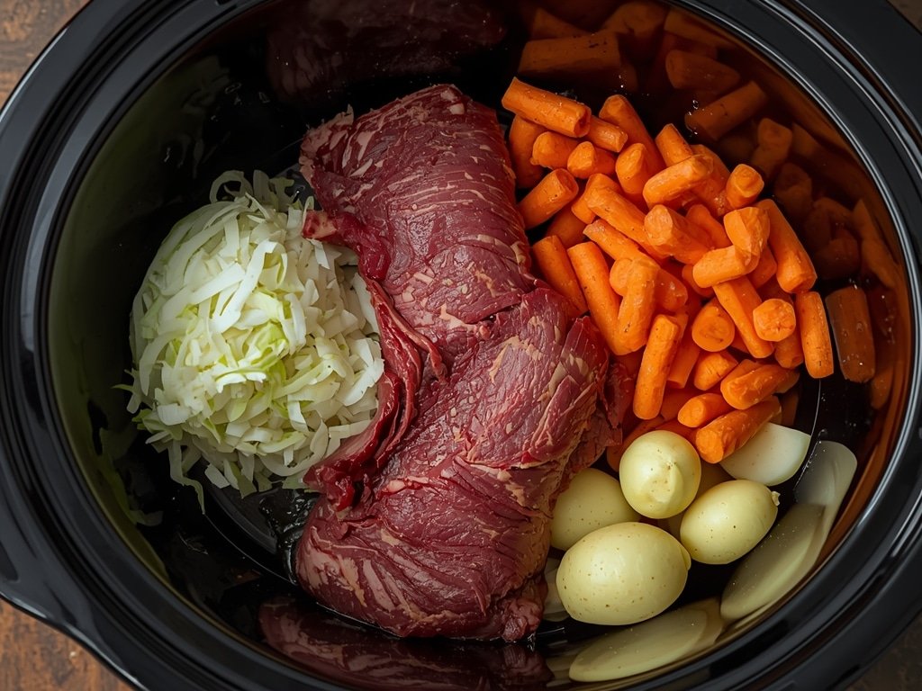 - 2. Add the Vegetables: Add the quartered onion, baby carrots, and quartered potatoes around the corned beef. Evenly distribute the vegetables for uniform cooking.