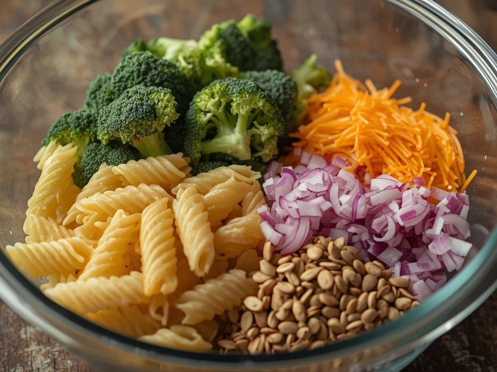 3. In a large bowl, combine cooled pasta, broccoli, red onion, cheddar cheese, sunflower seeds, and bacon (if using).