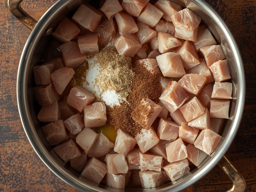 - 1. Prepare the Chicken: In a bowl, combine the chicken cubes with olive oil, garlic powder, onion powder, paprika, salt, and pepper. Toss to coat evenly.