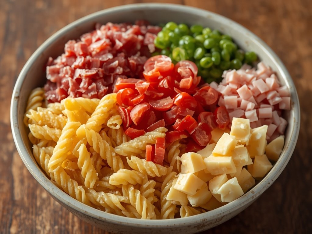 The key ingredients usually include cooked pasta, a variety of Italian deli meats (such as salami, pepperoni, and ham), provolone cheese, fresh vegetables (like tomatoes, red onion, and lettuce), and a tangy vinaigrette dressing.
