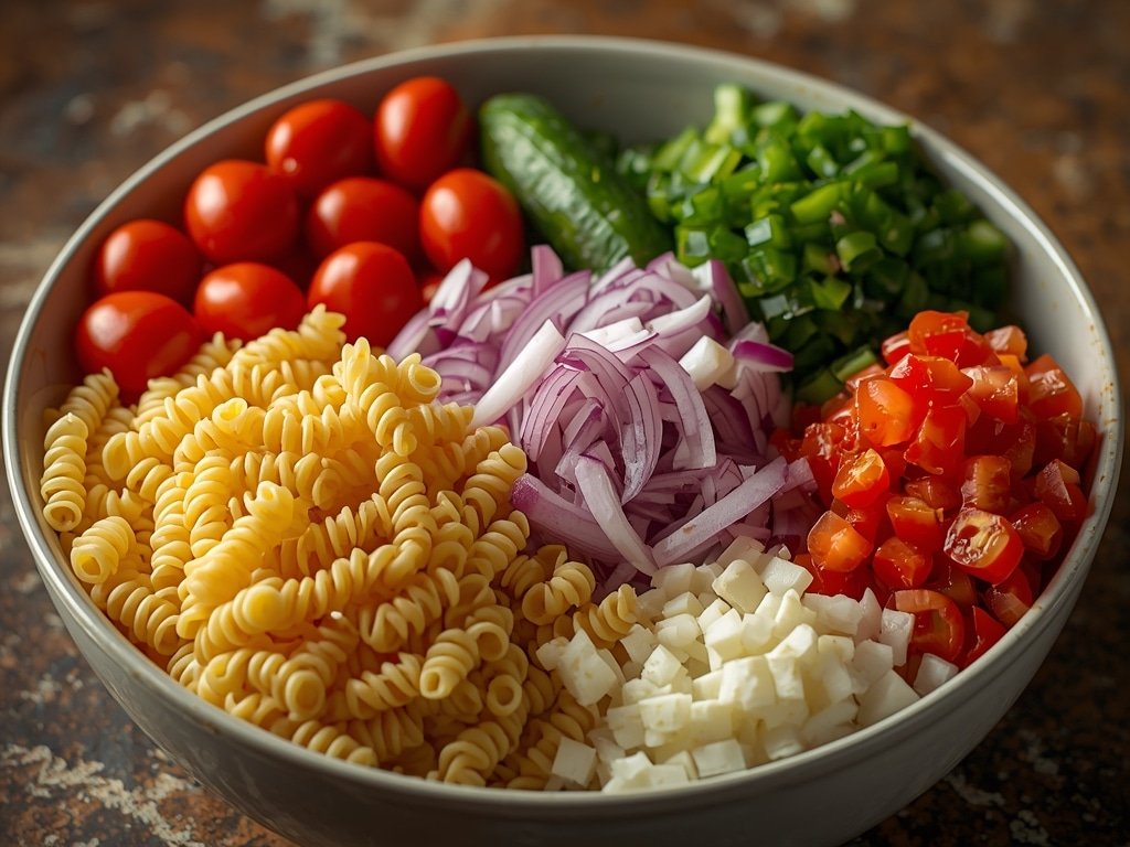 The best ingredients include rotini or farfalle pasta, fresh vegetables like tomatoes, cucumbers, bell peppers, and red onion. Other great additions are mozzarella cheese, olives, pepperoni, and a zesty Italian dressing.