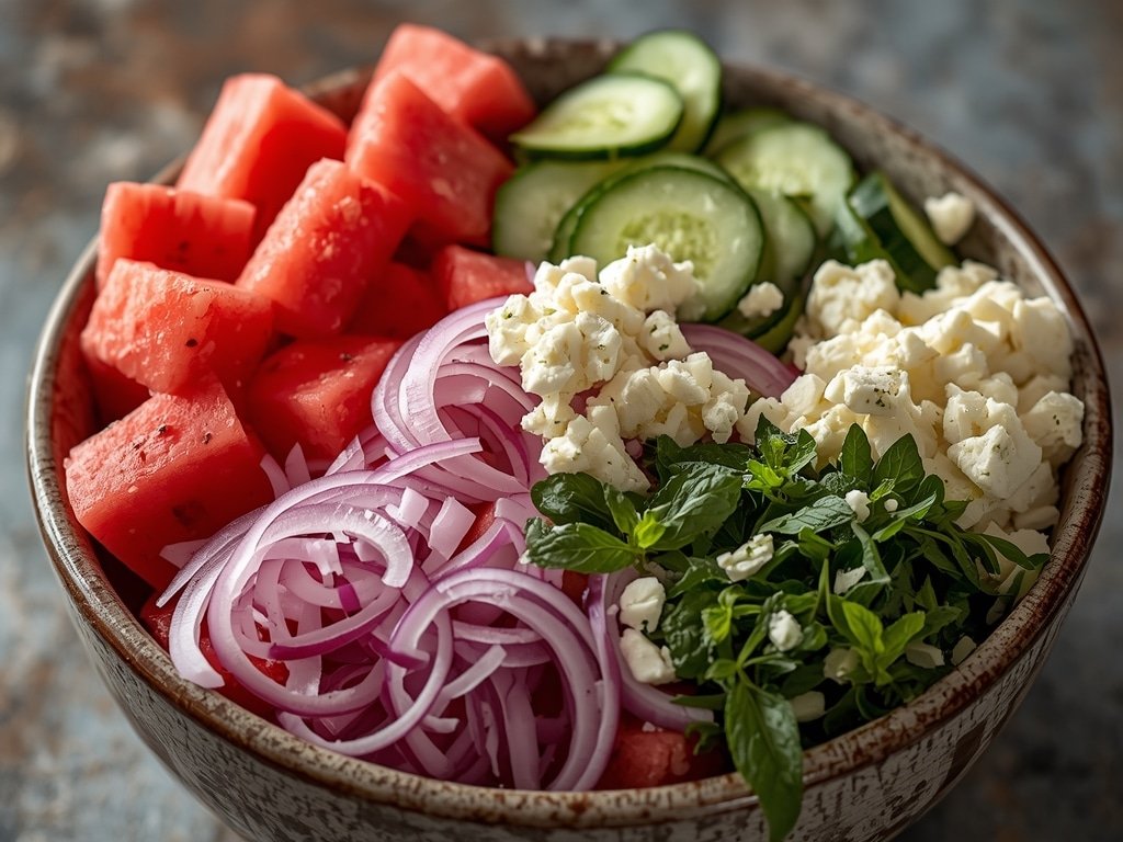 The best ingredients are fresh, in-season watermelon and cucumber. Adding feta cheese, red onion, mint, and a lime-based dressing enhances the flavor profile and creates a well-balanced salad.
