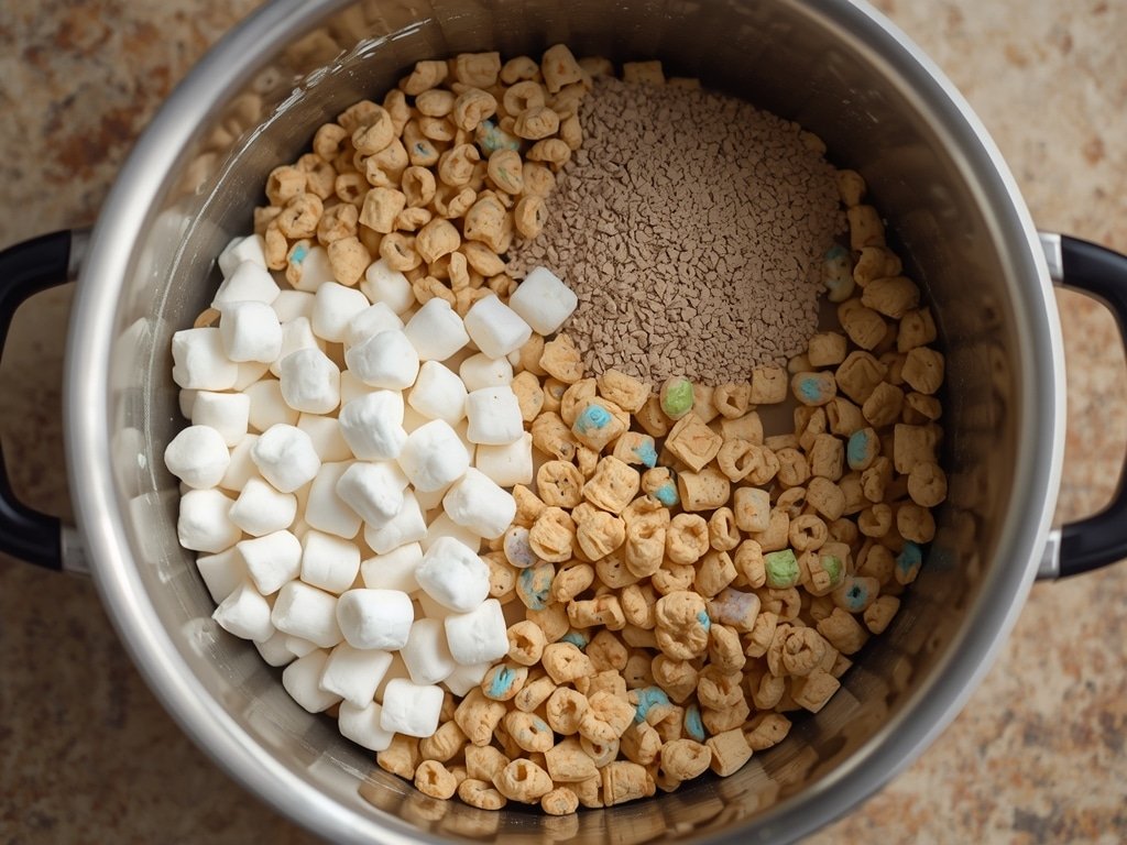 - Combine Cereal and Marshmallow Mixture: Pour the Lucky Charms cereal into the marshmallow mixture and gently fold until the cereal is evenly coated. Be careful not to crush the cereal.