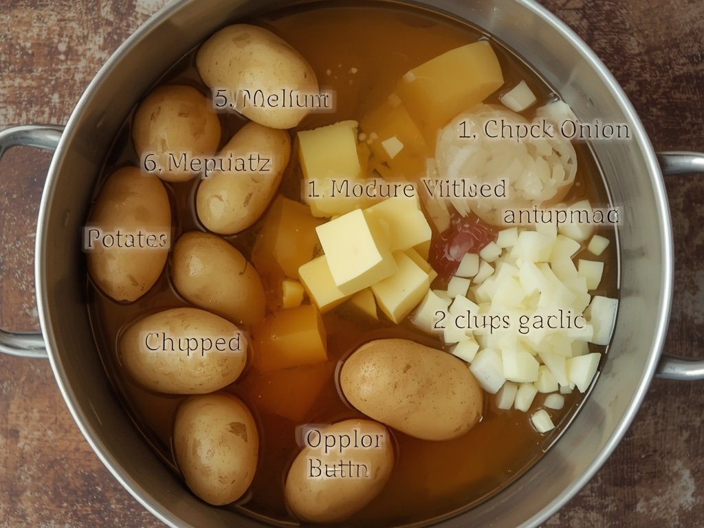 - 4. Cook Potatoes: Add the peeled and cubed potatoes to the pot. Bring the mixture to a boil, then reduce heat to low, cover, and simmer for 15 20 minutes, or until the potatoes are tender.