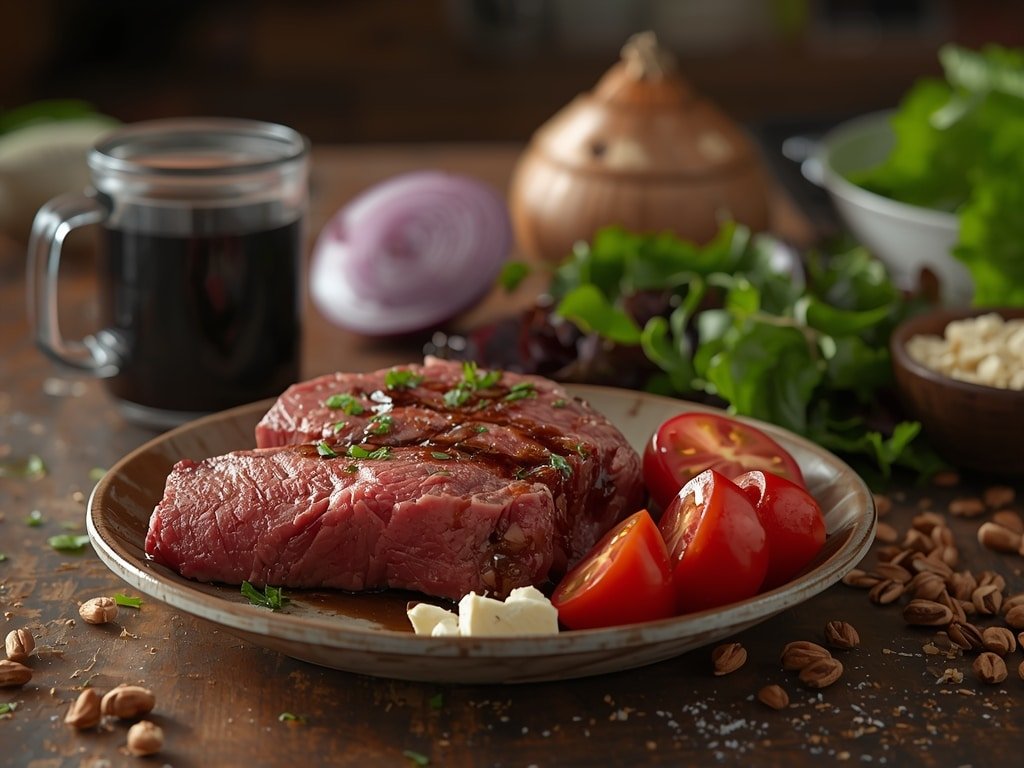 1. 1. Prepare the Marinade: In a medium bowl, whisk together the balsamic vinegar, olive oil, minced garlic, Dijon mustard, dried oregano, salt, and pepper.n2. Marinate the Steak: Place the steak in a resealable plastic bag or shallow dish. Pour the marinade over the steak, ensuring it’s evenly coated. Marinate in the refrigerator for at least 30 minutes, or up to 4 hours.n3. Prepare the Grill: Preheat your grill to medium high heat, approximately 400 to 450°F (200 to 230°C).n4. Grill the Steak: Remove the steak from the marinade, discarding the marinade. Place the steak on the preheated grill and cook for 4 to 6 minutes per side for medium rare.n5. Rest the Steak: Remove the grilled steak from the grill and transfer it to a cutting board. Tent it loosely with foil and let it rest for at least 5 to 10 minutesn6. Assemble the Salad: While the steak is resting, prepare the salad base by combining the mixed greens, halved cherry tomatoes, and thinly sliced red onion in a large bowl.n7. Slice the Steak: After the steak has rested, slice it thinly against the grain.n8. Add the Steak and Cheese: Add the sliced steak to the salad bowl. Sprinkle the crumbled gorgonzola cheese and toasted pine nuts (if using) over the steak and greens.n9. Dress and Serve: Drizzle the salad with balsamic glaze (optional) and serve immediately.